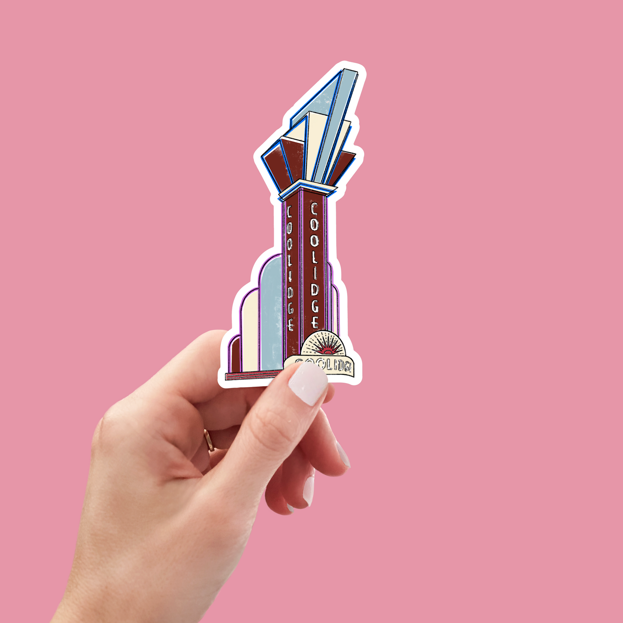 Die cut vinyl sticker featuring the iconic Coolidge Corner Theater sign.